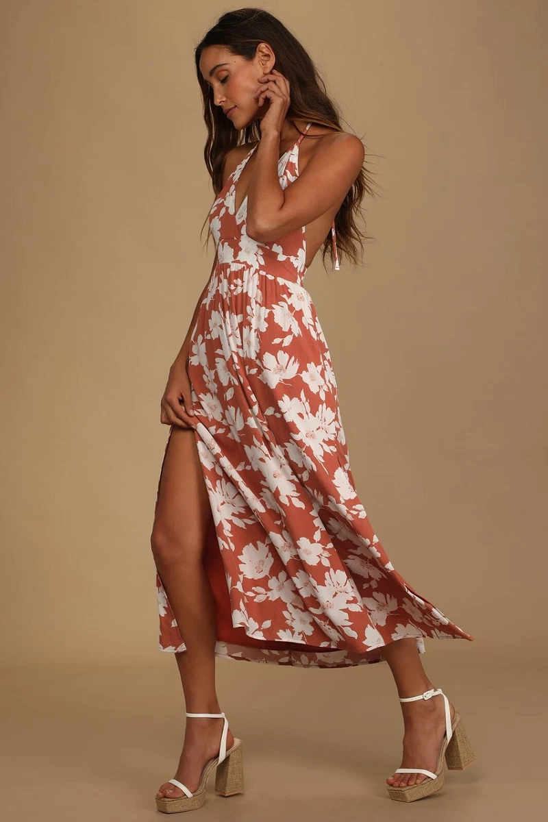 Lulus Nwt Orange White Floral Crepe Halter Flowy Midi V Neck Dress Sz M Ebay